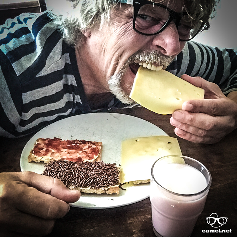 En zo eet ik al jaren uw knäckebröd, tot groot genoegen. Heel gebalanceerd; twee met kaas, één met jam en als afsluiter één met veel boter én hagelslag. Dat alles weggespoeld met Albert Heijn's Basic Drinkyoghurt (aardbeiensmaak, uiteraard). Yummy!