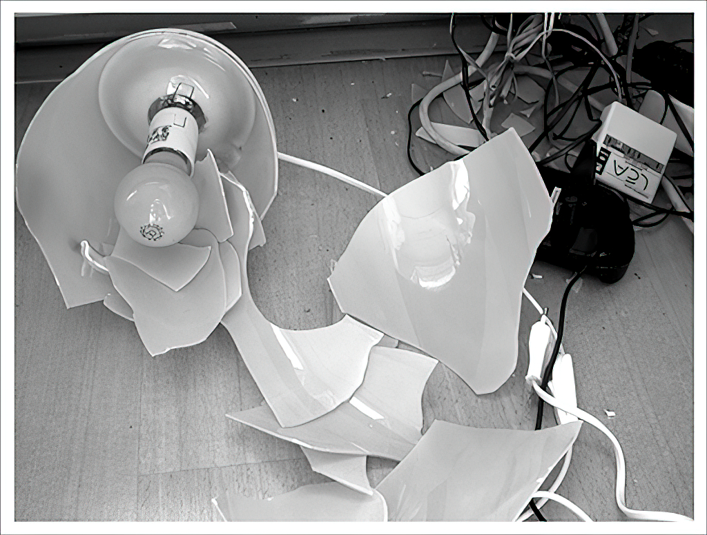 Uw eamel (ruw wakker gemaakt door een gooi-es-een-baksteen-door-je-ruit-geluid), gewapend met een strijkijzer, in zijn blote pikketanussie de trap af op zoek naar een vermeende inbreker om er vervolgens achter te komen dat Ikea-gedrocht nummer drie is gesneuveld in de kattenstrijd die eamel's Waterloo heet.
