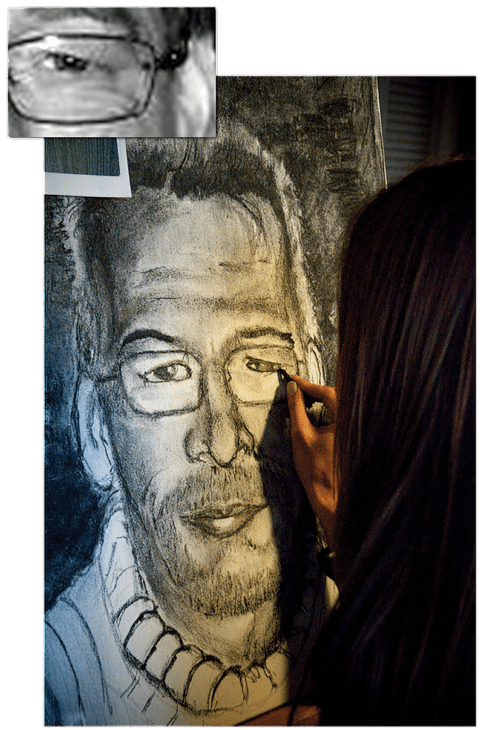 Het rechteroog; geen enkel probleem. Hup, een paar minimalistische lijntjes ét voila; een bijna perfect gelijkende kijkert.