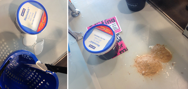 Terwijl Eldert (♪"Ah, ik zie dat u de juiste verf al gevonden heeft…"♪) zich in het zweet werkt om de verf chirurgisch en met veel zand in een plastic zakje te deponeren raap ik m'n telefoon op en schiet vlug wat foto's. Wachten moet ik toch. De kassamevrouw heeft ongezien een nieuwe emmer verf op de band gezet, kijkt me stoïcijns aan ("vrij van alle hartstochten") en vraagt: "Heeft u een voordeelpas?"