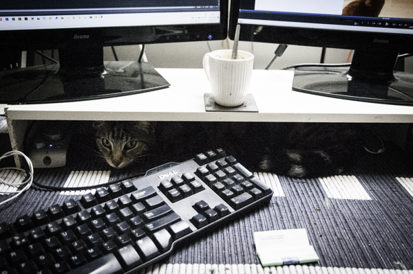 - En dan heb je nog die katten die je in de gaten houden terwijl je kattenfilmpjes bewerkt van katten die zich zoveel jaar later nòg afvragen hoe die ijsbeer in dat platte kastje terecht gekomen is.