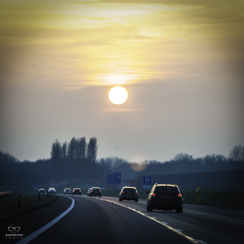 Dat van die zon werd nog een dingetje want waar Bram me al voor waarschuwde geschiedde; een enorme file in de buurt van Hajé.